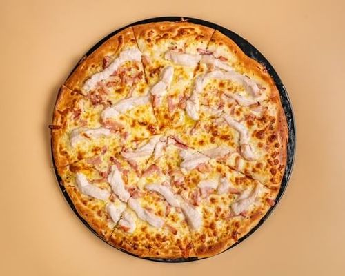 Garlic butter base topped with mozzarella, bacon and choice of chicken breast or king prawns.